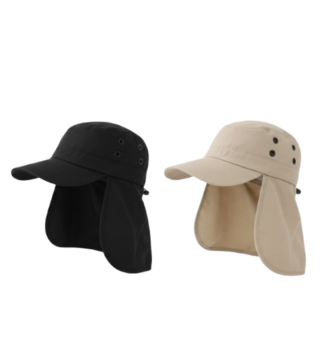מבנה הכובע: מצחייה קשיחה להגנה על העיניים ושכבת בד היקפית ארוכה לכיסוי מלא של העורף והצדדים.