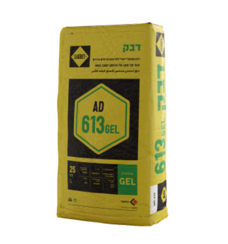 AD 613 GEL הוא דבק פרימיום המבוסס על "טכנולוגיית ג'ל" מהפכנית שמעניקה עבידות יוצאת דופן ונוחות עבודה מרבית. מרקם הג'ל מבטיח כיסוי מלא ואחיד של גב האריח, מונע חללים ריקים ומונע ביעילות גלישה של אריחים כבדים וגדולים על קירות. בזכות זמן פתוח ארוך במיוחד וגמישות משופרת S1 הוא מספק פתרון בטוח ועמיד לאורך שנים בחיפוי וריצוף פנים.