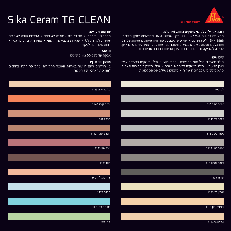 רובה אקרילית צמנטית חד-רכיבית (מוכנה לשימוש) ומכילה ננו-חלקיקים. מתאימה כמילוי פוגות באריחים של פנים, חוץ ובמיוחד לאזורים רטובים שיש בו שטיפות מרובות כמו בריכות שחייה פרטיות. רובה אקרילית בעלת כושר עמידות גבוהה כדוחה מים, קלה מאוד לניקוי, בעלת שמירה גוון צבע ועמידה בבליה מוגברת ובכימיקלים קלים.