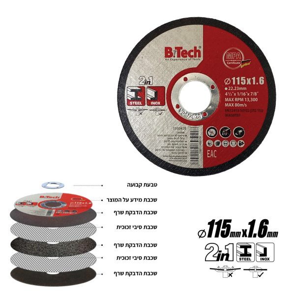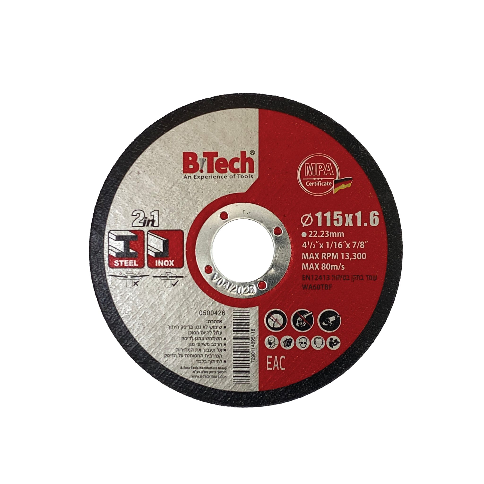 דיסק חיתוך איכותי מבית B.Tech, המציע חיתוך ברזל ונירוסטה באותו הכלי, ובכך לחסוך זמן החלפה יקר. בזכות עיצובו הדק, הדיסק מספק חיתוך מדויק, מהיר וללא עיוותים. הוא בעל עמידות גבוהה ומותאם למשחזות זוויתיות שונות. זהו פתרון חסכוני ואידיאלי למסגרים, חשמלאים וכל אנשי מקצוע שזקוקים לדיסק אמין לשני סוגי המתכות.