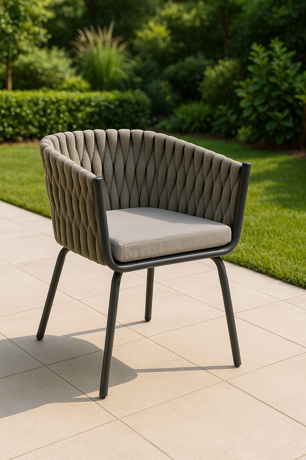 כיסא חוץ יוקרתי, מושלם לפינות אירוח מודרניות בגינה או במרפסת, עם שילוב של אלומיניום, חבל אופלין וכרית מושב נוחה. יוצר חוויית ישיבה נינוחה לאורך זמן בייחוד לארוחות חוץ, קפה של בוקר או ערב רגוע.