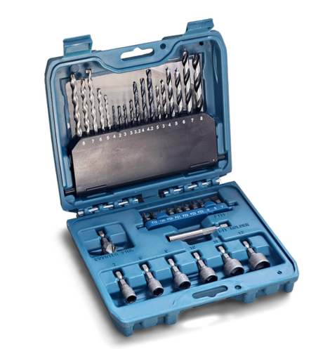 תכולה: מקדחים, ביטים, בוקסות הברגה, מאריך ושקען.