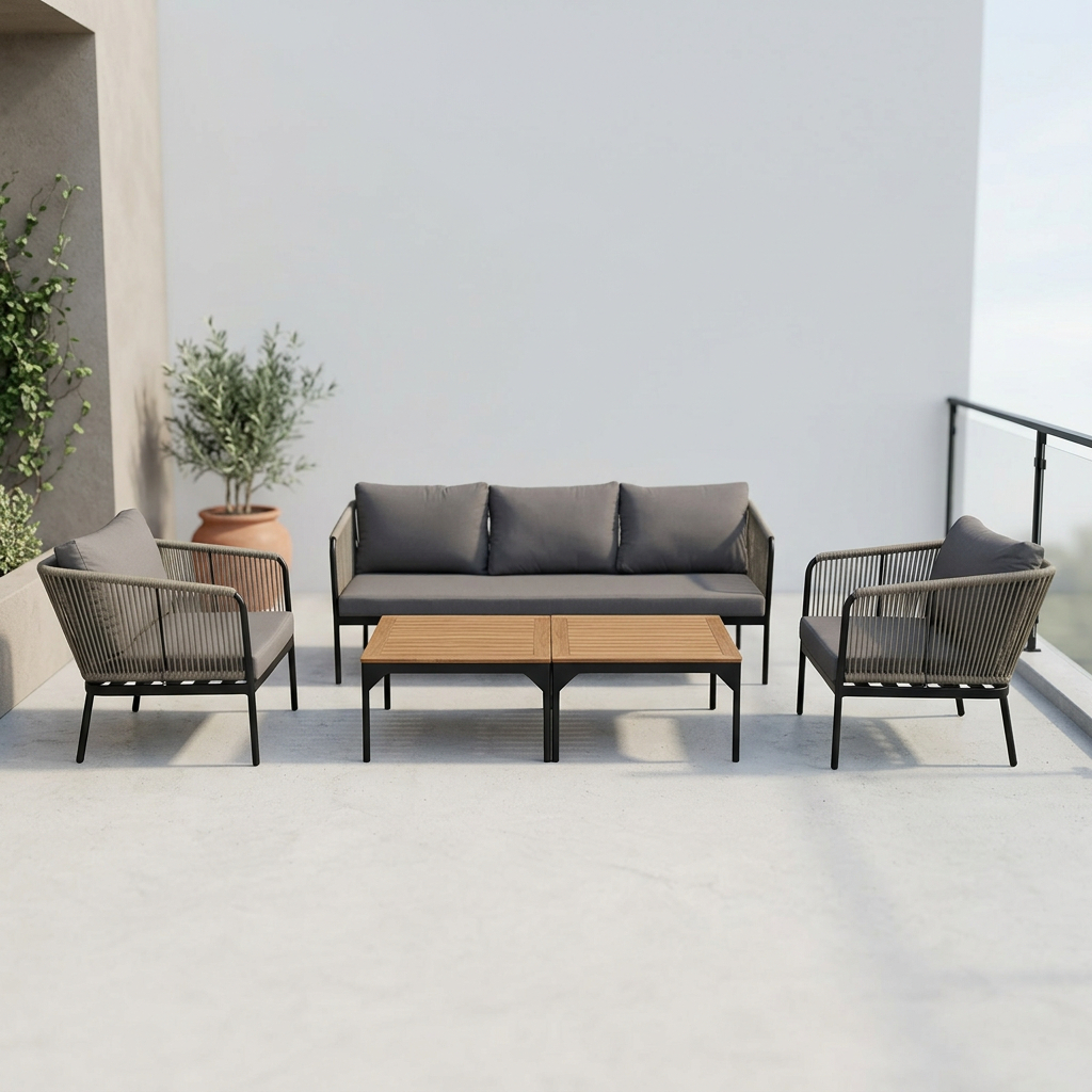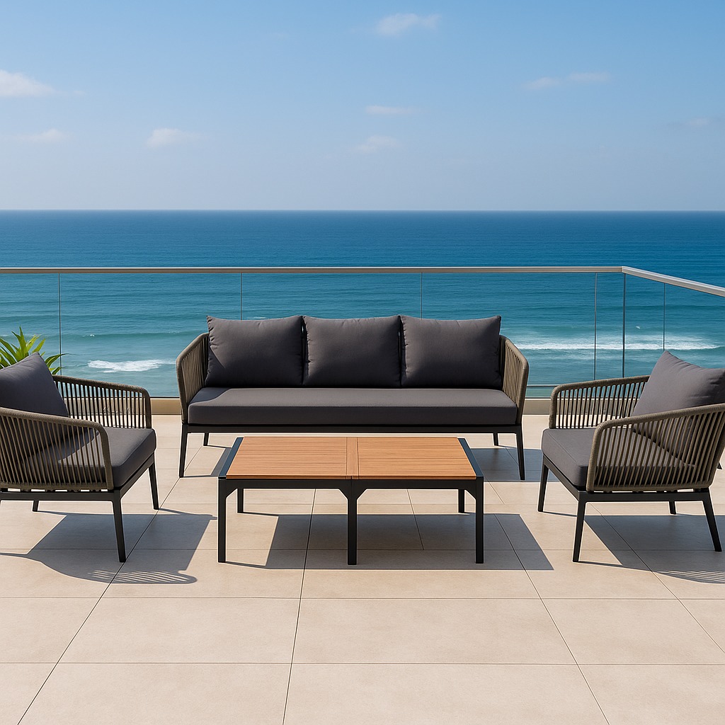 פינת ישיבה יוקרתית לגינה או למרפסת הכוללת ספה זוגית, 2 כורסאות ושולחן קפה. פינת הישיבה בעלת מראה מודרני ואלגנטי, שמשדר נוחות ורוגע עם תחושת חוף וחופשה יוקרתית בבית או במרפסת.
