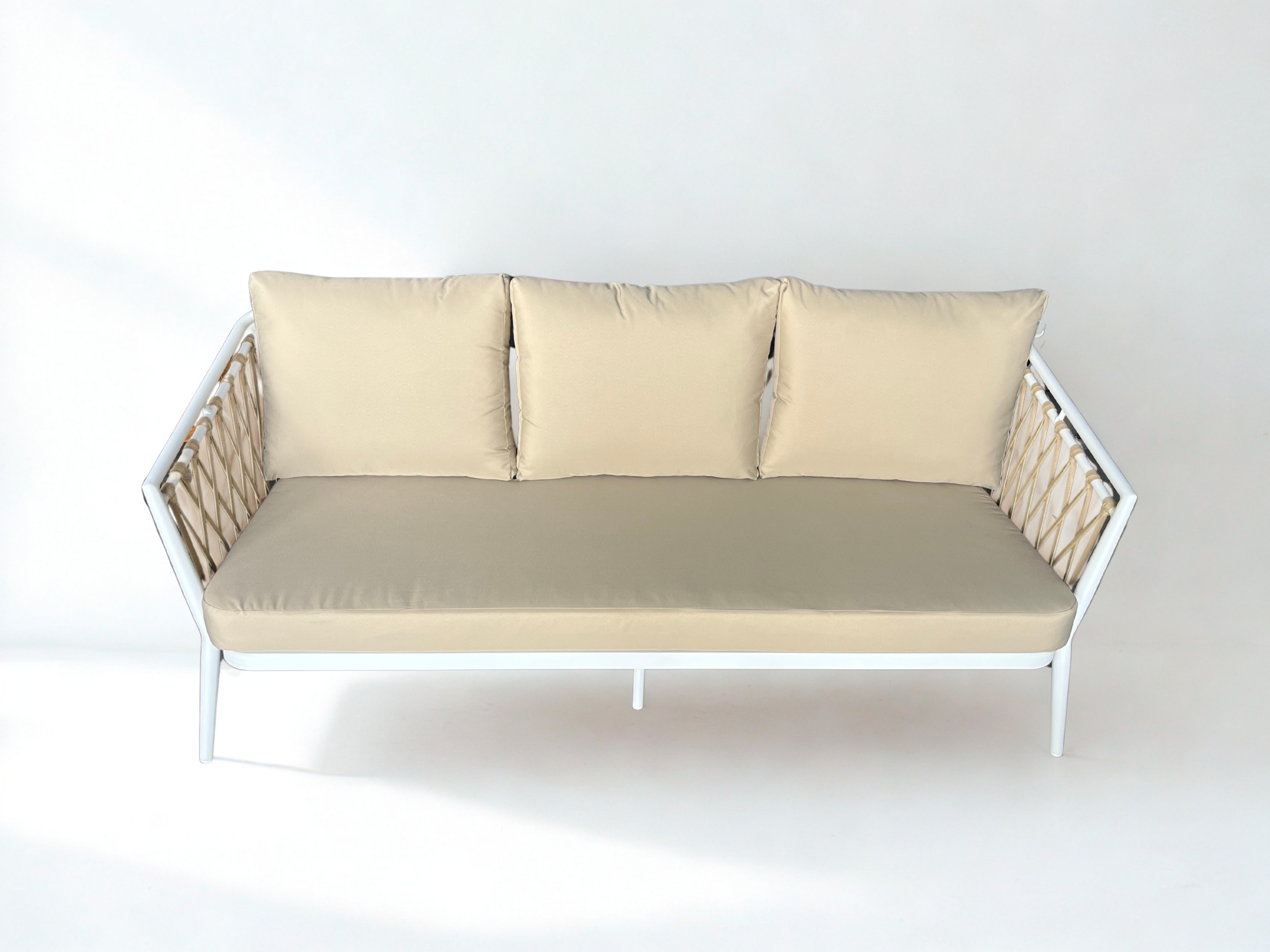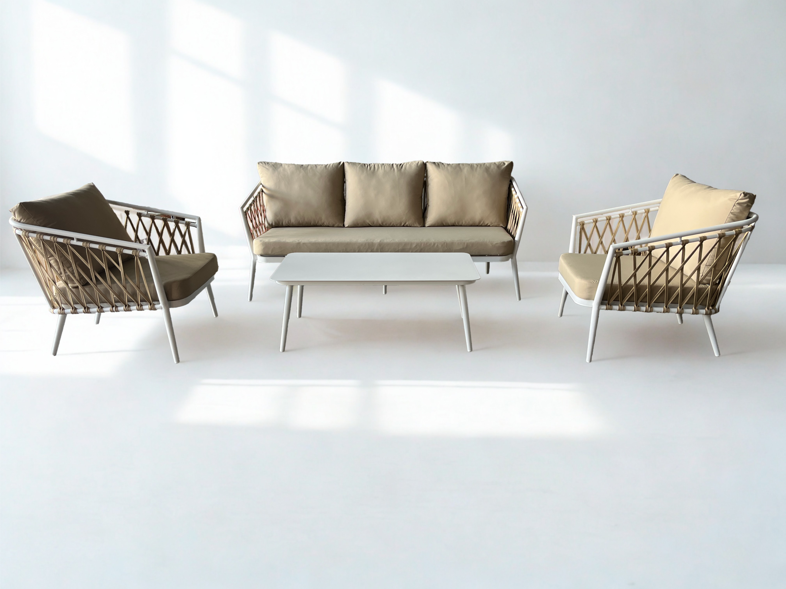 פינת ישיבה יוקרתית לגינה או למרפסת הכוללת ספה תלת מושבית, 2 כורסאות ושולחן קפה. פינת הישיבה בעלת מראה מודרני ואלגנטי, שמשדר רוגע ונוחות עם תחושת חוץ מזמינה ונעימה.