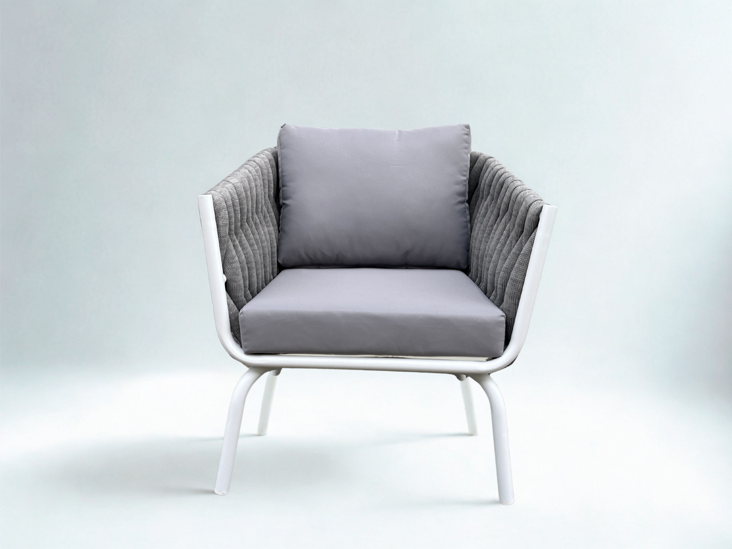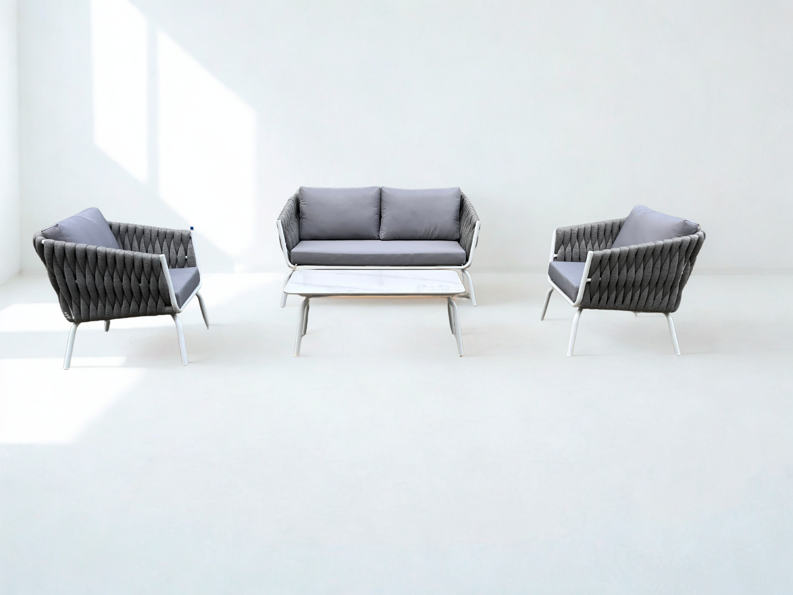 פינת ישיבה יוקרתית לגינה או למרפסת הכוללת ספה זוגית, 2 כורסאות ושולחן קפה. פינת הישיבה בעלת מראה מודרני ואלגנטי, שמשדר רוגע ונוחות עם תחושת חוץ יוקרתית ונעימה.