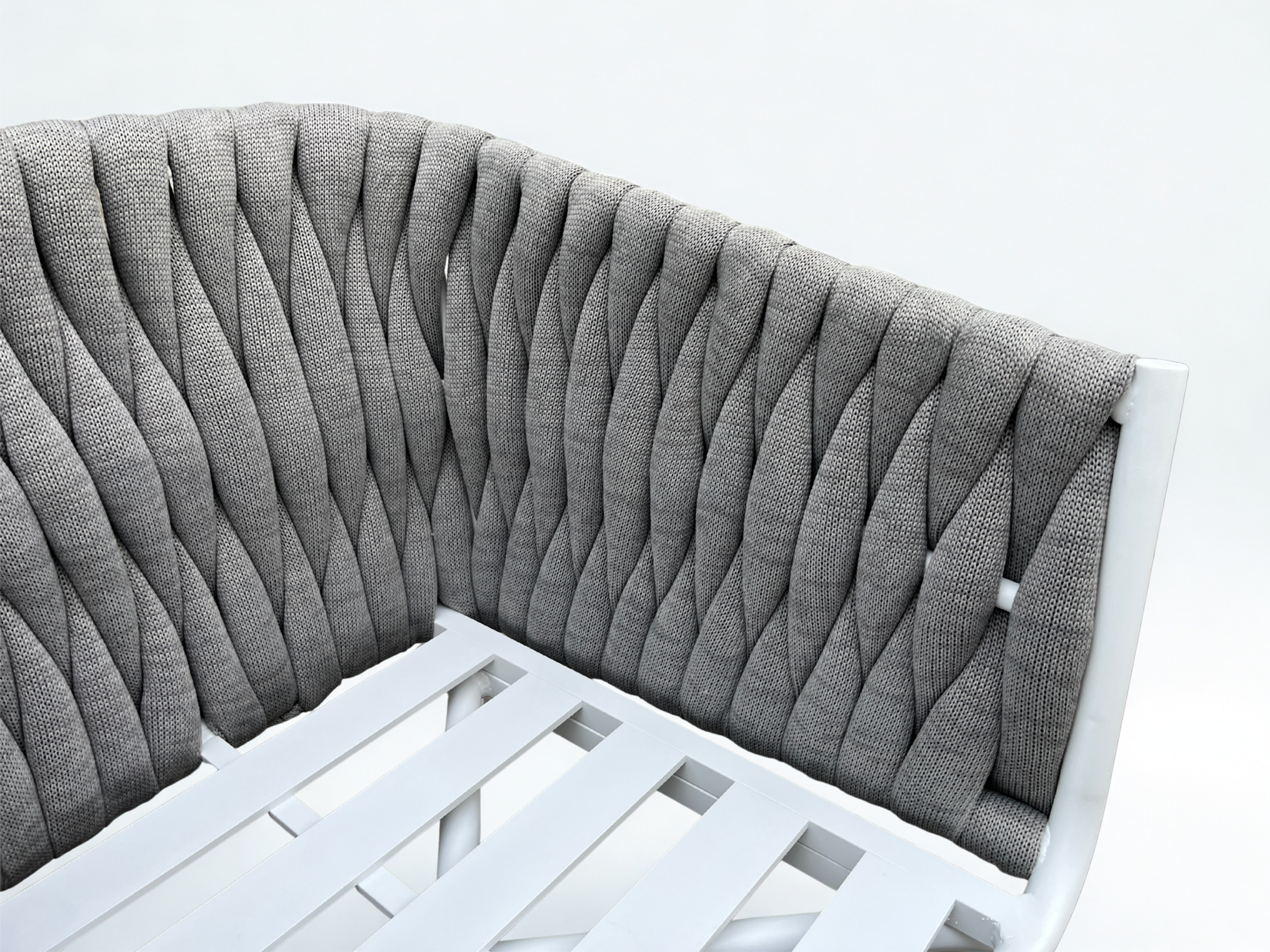 צבעים: מסגרת אפורה, חבלים טבעיים, משטח שולחן אפור טבעי, כריות לבן/קרם.