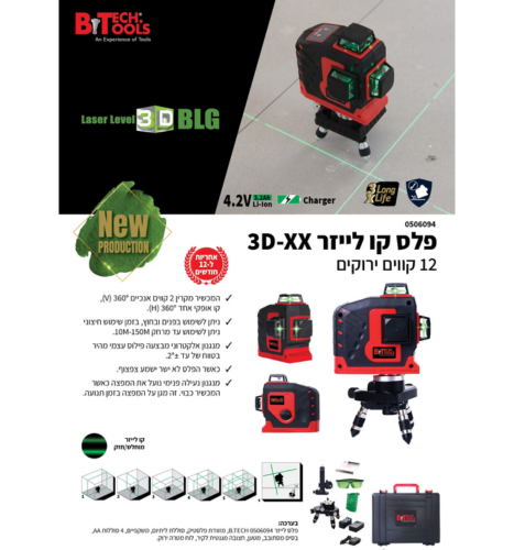 פלס לייזר 3D-XX ירוק 12 קווים- B.TECH